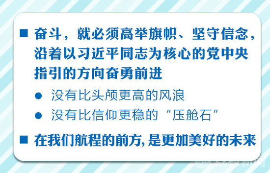 奋斗,就必须高举旗帜、坚守信念,沿着以习近平同志为核心的党中央指引的方向奋勇前进。旗帜就是方向、信念就是力量、核心就是我们奋斗的主心骨。中国特色社会主义事业是人类历史上最辉煌的事业,党的十八大以来,以习近平同志为核心的党中央以巨大的政治智慧和勇气,推动党和国家事业发生历史性变革、取得历史性成就,中国特色社会主义进入新时代。江苏大地上的发展成就,就是这一伟大事业的生动篇章。我们要始终高举习近平新时代中国特色社会主义思想伟大旗帜,对标新思想不断地解放思想、统一思想,结合江苏实际深入地贯彻新思想、落实新思想。我们要树牢“四个意识”,坚定“四个自信”,践行“两个维护”,在习近平总书记的掌舵领航下,迎着风浪,开足马力,扬帆远航。我们坚信,没有比头颅更高的风浪,没有比信仰更稳的“压舱石”,在我们航程的前方,是更加美好的未来。