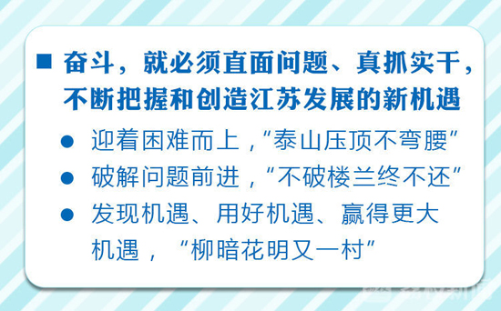 奋斗,就必须直面问题、真抓实干,不断把握和创造江苏发展的新机遇。前进的道路总是充满困难和问题,克服困难、解决问题的过程就是创造机遇、走向成功的过程。我们要迎着困难而上,不回避、不推诿、不停步,做到“泰山压顶不弯腰”;我们要破解问题前进,逢山开路、遇水搭桥,真抓实干、从容应对,做到“不破楼兰终不还”;我们要在解决问题中发现机遇、用好机遇、赢得更大机遇,迎来发展的“柳暗花明又一村”。我们坚信,所有的机遇都是为奋斗者准备的,所有大事业都是从解决具体问题入手,所有的成功都是在真抓实干中造就,我们的态度和行动就是对新时代新机遇的生动诠释、有力注解。