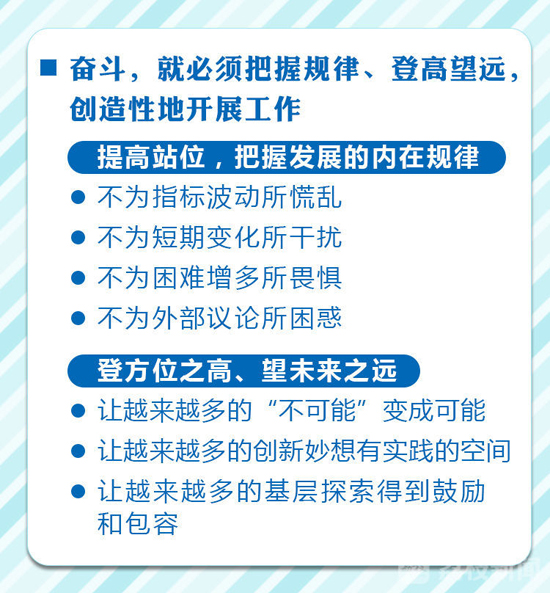 奋斗,就必须把握规律、登高望远,创造性地开展工作。奋斗从来不是盲目的、机械的、低层次重复的。越是在深刻的变化变局中,我们越是要提高站位,透过纷繁复杂的事物表象,把握发展的内在规律,不为指标波动所慌乱、不为短期变化所干扰、不为困难增多所畏惧、不为外部议论所困惑。我们要登方位之高、望未来之远,在守住稳定、环保、安全、廉洁“四条底线”的前提下,创造一切条件,让越来越多的“不可能”变成可能,让越来越多的创新妙想有实践的空间,让越来越多的基层探索得到鼓励和包容。我们坚信,江淮大地上蕴藏着无限的创造潜力,任何事情,只要符合党的要求、符合人民意志、符合客观规律,只要我们认识清、把握准、谋划好,就一定能干得最好、干出一个又一个发展奇迹。