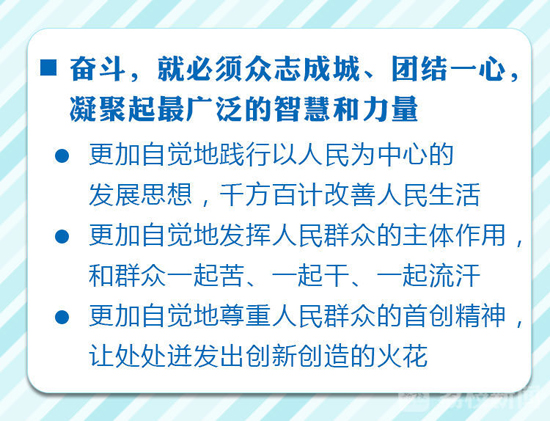 奋斗,就必须众志成城、团结一心,凝聚起最广泛的智慧和力量。人民是历史的创造者,江苏的美好未来要靠千千万万的双手去开创。8000万江苏人民、1000万市场主体、1000万知识分子、100多万科技人员以及广大的产业工人、能工巧匠、现代农民,就是我们奋斗的力量所在、优势所在、底气所在。我们要更加自觉地践行以人民为中心的发展思想,始终站稳群众立场,真心实意解决民生关切,千方百计改善人民生活;更加自觉地发挥人民群众的主体作用,紧紧依靠人民群众推动改革发展,和群众一起苦、一起干、一起流汗;更加自觉地尊重人民群众的首创精神,让田间地头、工厂车间、实验室、工作室处处迸发出创新创造的火花。我们坚信,每一份力量汇聚起来,每个人的光辉融入时代的发展,江苏的星空就会群星闪耀、灿烂夺目。