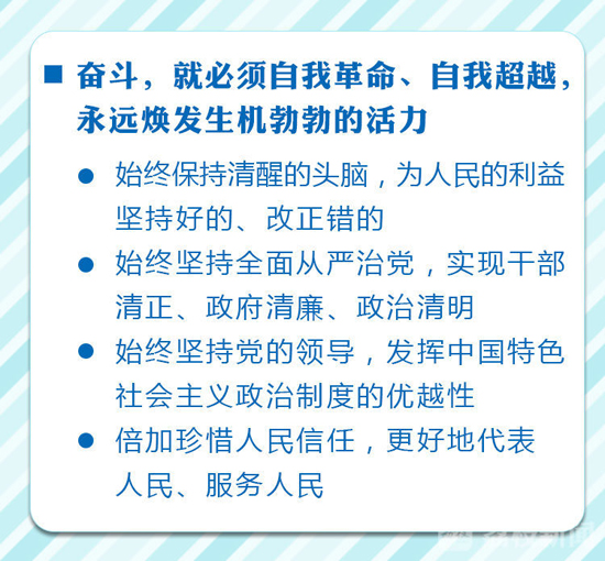 奋斗,就必须自我革命、自我超越,永远焕发生机勃勃的活力。勇于自我革命,是中国共产党人最鲜明的品格和最大的优势,是中国革命事业和社会主义建设不断取得胜利的重要法宝。我们要始终保持清醒的头脑,从党的根本宗旨和国家的性质去检视自己的工作,不掩饰缺点、不文过饰非,为人民的利益坚持好的、改正错的。要始终坚持全面从严治党,坚决与一切错误思想作斗争,坚决与一切不正之风作斗争,坚决与一切腐败现象作斗争,努力实现干部清正、政府清廉、政治清明。要始终坚持党的领导,加强和改进人大工作,保证人民当家作主,更好发挥中国特色社会主义政治制度的优越性。人大代表要倍加珍惜人民信任,不断进行自我净化、自我提升,更好地代表人民、服务人民。我们坚信,最非凡的成功不是超越别人,而是战胜自己;最可贵的坚持不是久经磨难,而是永葆初心。有了这样的保障,我们的政治生态一定会更加清朗,我们的事业也一定会万古长青。