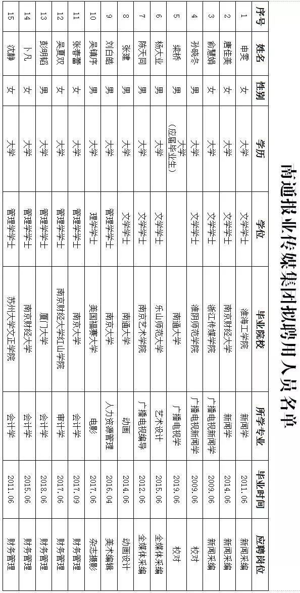 根据《南通报业传媒集团2018年招聘简章》的要求,经笔试、面试、体检和考察等程序,确定申雯等15名同志为拟录用员工,现予以公示。如有异议,请向集团纪检监察审计室、人力资源部反映。