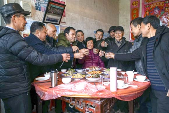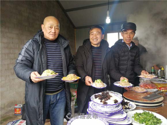 陈荣在外创业,一直心系牺牲战友的父母亲,每年清明节都专程赶回如东烈士陵园为牺牲的战友扫墓。每年春节期间,厨师非常忙,今年春节前夕,他委托在家乡的战友先后联系了10多位厨师,最终一位厨师得知他们为烈士父母尽孝,放弃原定的生意。陈荣在微信上选定菜谱,采购优质熟食和宴席食材,请厨师忙了20多道菜。宴席开始,陈荣把烈士父母张志连、蔡志仙请上上座,与战友们一起端起酒杯,在一声声祝福声中,向英雄父母敬酒。席间,陈荣频频为烈士父母夹菜,吃着鲜美的菜肴,老人家喜笑颜开。临走时,张志连老人家送上专门加工采购的海产品,让远离家乡“儿子”带回去品尝。