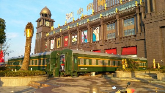 设置在中南城南侧广场、存在已经两年多的两节绿皮火车车厢全长近50米,车厢下垫有枕木。据车厢主人刘先生介绍,他在其他城市看到火车咖啡馆,萌生了在南通也开一家的想法。在与中南城方面签订相关协议后,刘先生把原来黄色的退役工程车车厢改造成现在的绿皮火车车厢,并设法将车厢运到了广场上。不过,刘先生始终未能办理到相关的证照,火车车厢成了广场上尴尬的存在。