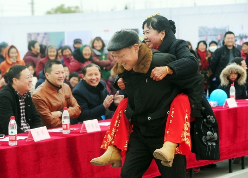 老公背着老婆跑、婆婆比划儿媳猜……昨天,一场特殊的闹元宵活动,在扬州市蜀冈-瘦西湖风景名胜区平山乡槐子村举行。元宵节也被称作中国情人节,当天,平山乡举办首届乡村爱情文化节,来自平山乡6个社区(村)的居民,欢聚槐子村文化广场,通过互动游戏,演绎夫妻情、婆媳情、亲子情,“乡村爱情节”主打的“好丈夫背媳妇”比赛,更是引得现场观众一阵阵高呼。