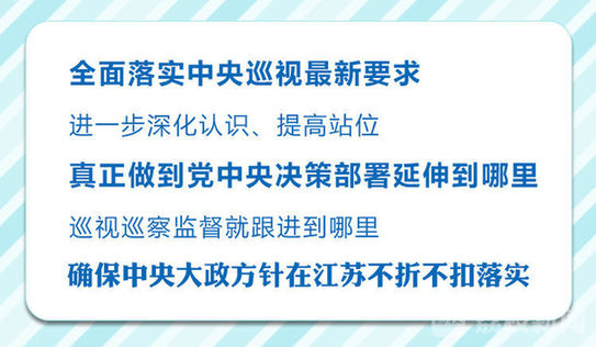 会议要求,要深入贯彻习近平总书记重要指示精神,全面落实中央巡视最新要求,进一步深化认识、提高站位,以更加科学、更加严密、更加有效的工作,推动我省巡视工作高质量发展。要聚焦中央和省委重大决策部署加强政治监督,突出政治巡视要求,坚决落实“两个维护”根本任务,认真筹备好省委第七轮巡视,充分发挥巡视监督的政治导向作用,紧扣党中央重大决策部署和国家重大战略在我省贯彻落实情况、省委省政府重点工作部署推进落实情况,按照“六围绕一加强”的要求深化监督检查,真正做到党中央决策部署延伸到哪里,巡视巡察监督就跟进到哪里,确保中央大政方针在江苏不折不扣落实。