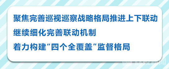 会议要求,要聚焦完善巡视巡察战略格局推进上下联动。坚持省委巡视与市县巡察、省直部门单位巡察同向发力,着力在规范、提升、拓展上下功夫,使各项创新举措真正立得住、推得开、有实效。要继续细化完善联动机制,统筹谋划巡视巡察联动方式和监督重点,促进巡视巡察有效贯通。要着力构建巡视巡察监督与纪律监督、监察监督、派驻监督“四个全覆盖”的监督格局,健全巡视巡察与组织、审计、信访等协作配合机制,凝聚监督合力。
