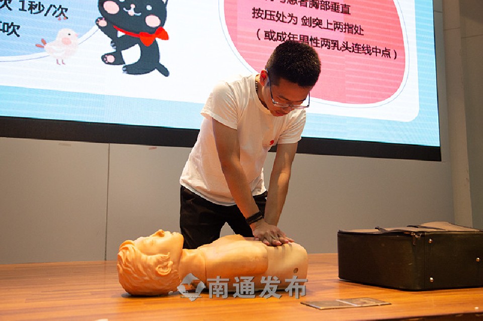 为普及医疗急救知识,进一步提高广大群众的自救互救能力,7月15日,南通大学启秀校区红十字会的志愿者来到博物苑,给南通市民进行了一场急救知识与技能操作专题讲座。此次活动受到市民们的一致好评。图文:朱晨昱 |
