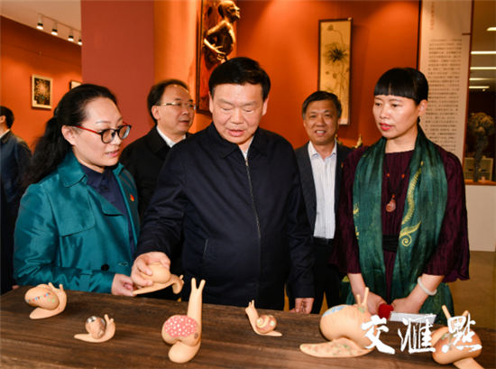 娄勤俭在无锡工艺职业学院展厅观看师生陶艺作品展示。交汇点记者 肖勇 摄