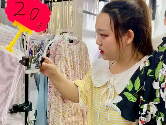 沧州明珠商贸城,一名女店员正在用手机直播的方式进行线上销售
