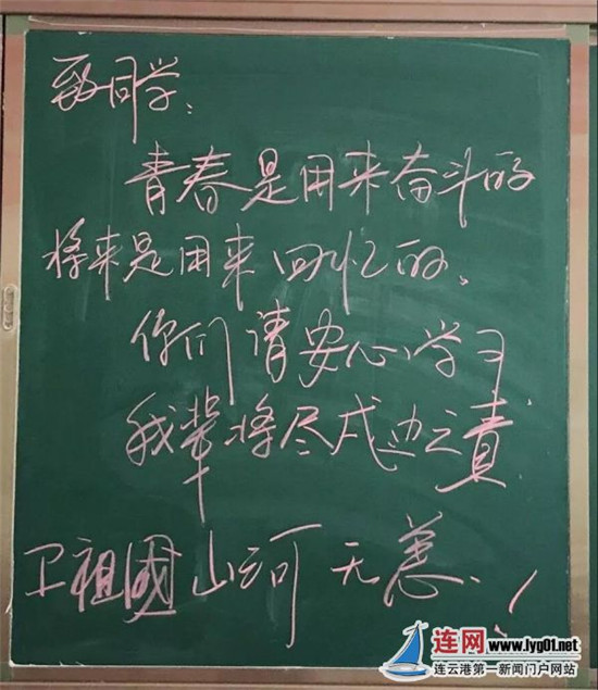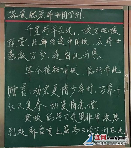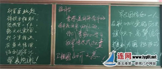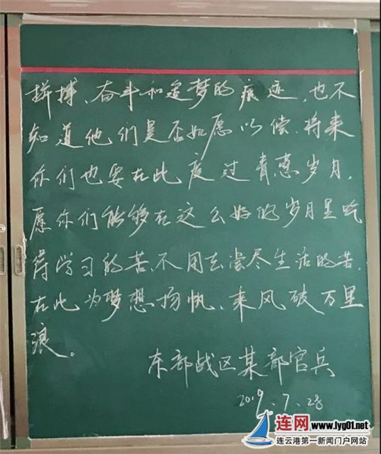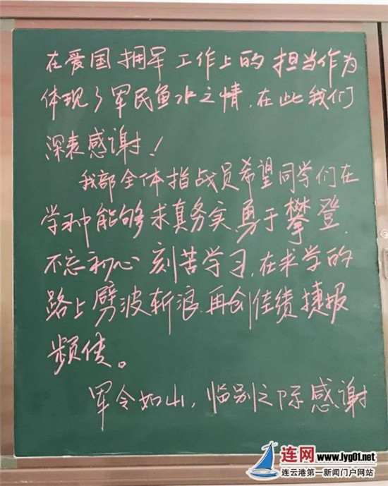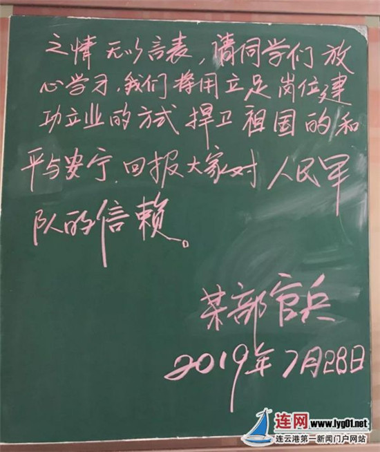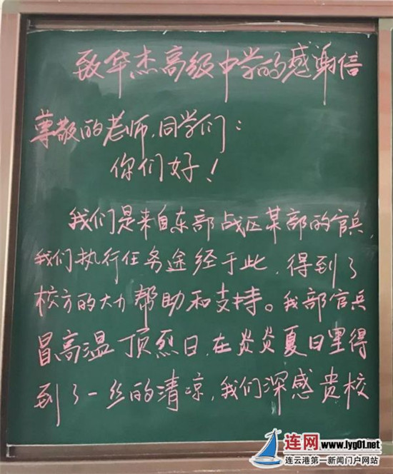 连云港华杰高级中学工作人员告诉记者,不久前,东部战区某部官兵执行任务途经连云港华杰高级中学,借住了三间教室。临行前,官兵们不但将教室恢复原样,打扫得一尘不染,还给同学们留下了几句话,鼓励他们好好学习,长大了报效祖国。