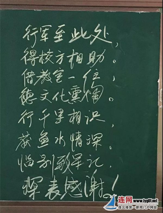 “行军至此处,得校方相助。借教室一住,得文化熏陶。行千里相识,获鱼水情深。临别致军礼,深表感谢!”
