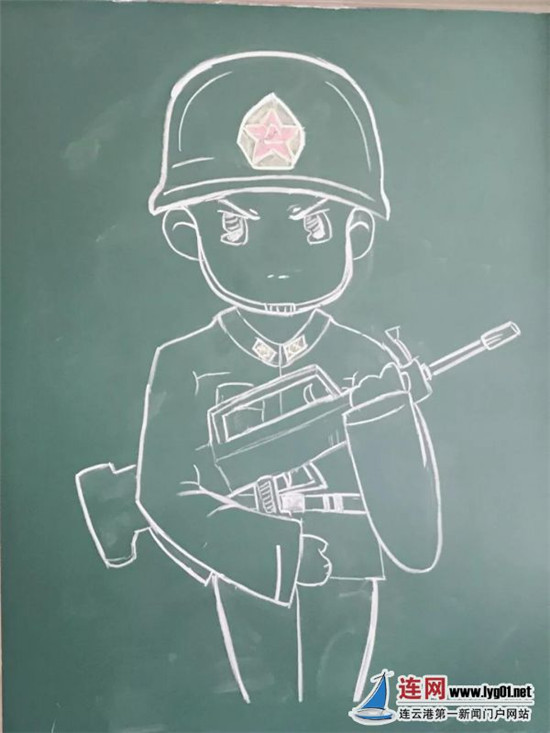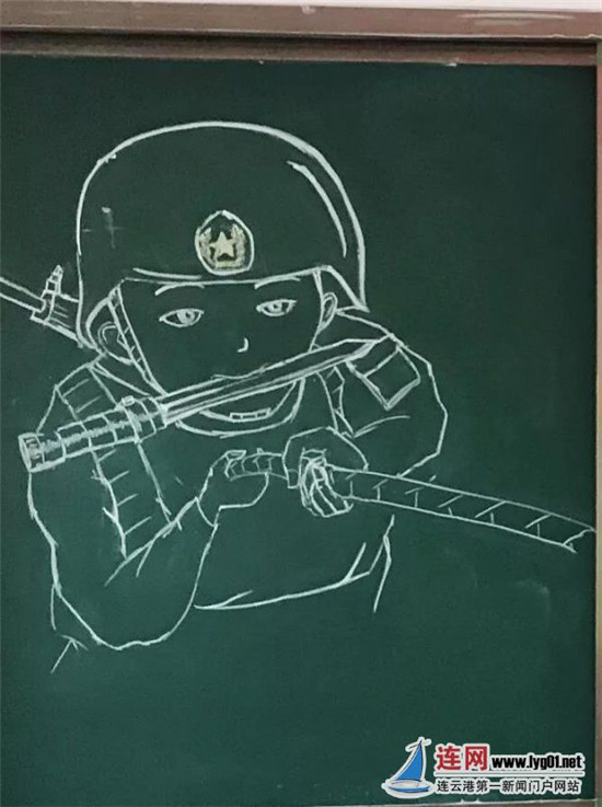 除了《感谢信》和留言,官兵们还用粉笔在黑板上画了几幅可爱的漫画:战士手持钢枪军姿挺拔、口含匕首紧抓绳索艰苦训练、特战部队帅气的臂章……