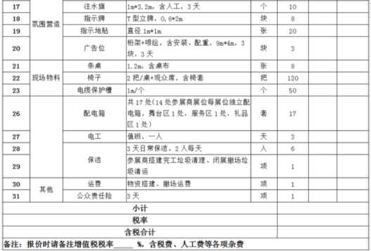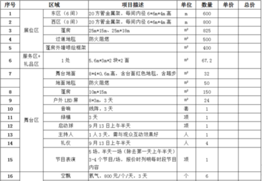 2.展位区篷房及过道地毯、篷房外墙喷绘框架等项视实际情况需求而定。