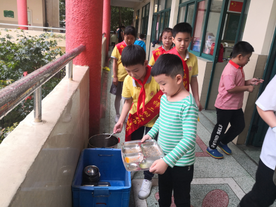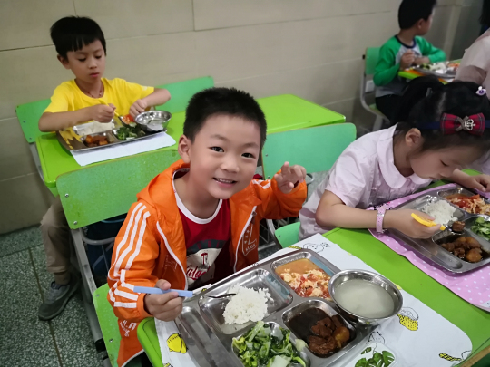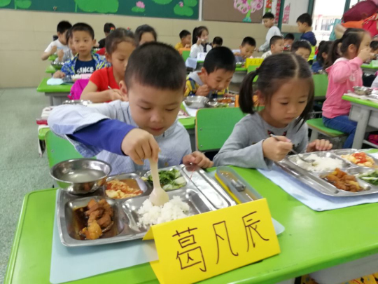 在一年级的教室里,新生们一个个吃饭香、吃得光,一些饭量大的小朋友还陆续到教室前添饭。
