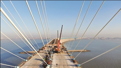 全部挂缆作业由中铁郑州缆索公司承担。中铁郑州缆索公司堪称国内的“挂缆专业户”,此前成功完成过武汉天兴洲长江大桥、黄冈长江大桥、安庆长江大桥、新白沙坨长江大桥、洞庭湖大桥等特大型桥梁的斜拉索挂设。尽管经验丰富,可他们认为沪通长江大桥的斜拉索安装难度为有史以来最大。在挂缆前,他们专门召开了专家评审会。在挂缆作业中,他们又相继克服了扇形密索体系施工工艺难度大、塔端和梁端空间不足、梁端软牵引长度长且牵引力大等诸多技术难题。经过整整15个月的努力,全部就位的432根斜拉索犹如一根根白色琴弦,飞扬在滔滔江面,奏出华美跨越乐章。