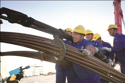 本网讯 昨天下午4时许,沪通长江大桥主桥第431根和第432根斜拉索几乎同时完成了梁端架设作业。至此,人类高速铁路时代首座跨度超越千米的公铁两用斜拉桥的架缆作业画上了圆满的句号。