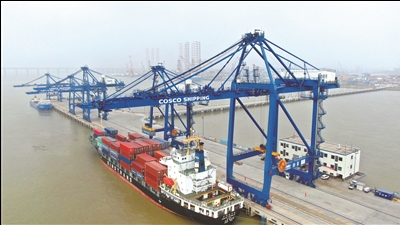 24日拍摄的通海港区集装箱作业区的画面。今年以来,通海港区集装箱吞吐量已突破百万标箱,预计今年全年可达110万标箱。 记者 许丛军摄 |