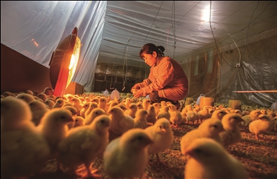 昨天,海安市角斜镇新坝村宇凡家庭农场内,村民正在利用养蚕大棚饲养肉鸡。新坝村引导村民在两期养蚕结束后的间隔期进行肉鸡套养,除养蚕的正常收入外,每平方米大棚还可增收近200元,有效带动了村民增收致富。 |