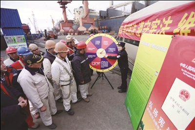 12月4日是国家宪法日。1日,如皋出入境边防检查站民警来到南通瑞泰船务码头,开展“‘宪’在行动”趣味普法主题活动,现场设立了宪法知识大转盘、飞镖趣味抢答等互动游戏环节,通过互动、有趣的游戏模式,引导码头外来务工人员尊法、守法、用法。 彭军君 吴松华摄 |
