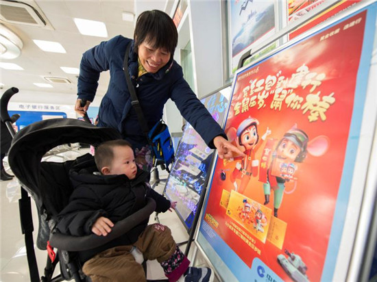 2019年12月19日,在中国建设银行海安现代城支行营业大厅内,金鼠压岁金宣传画吸引了一位小朋友的眼球。 徐劲柏 摄 |