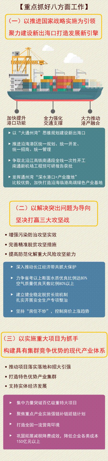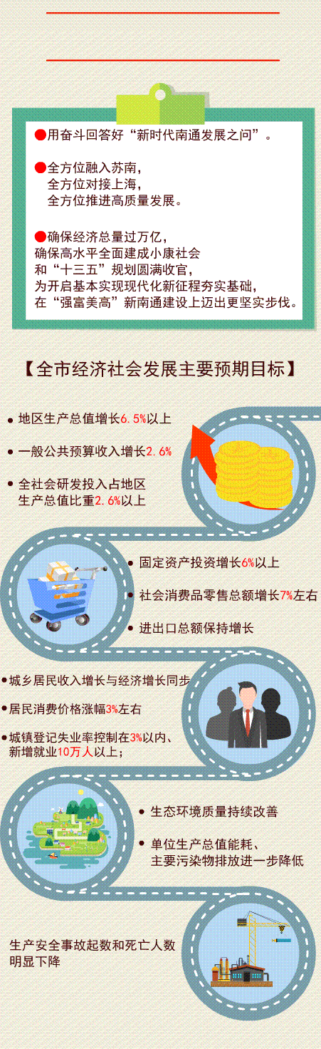 今天(7日),南通市十五届人大四次会议开幕。大会主席团常务主席徐惠民主持大会,王晖代表南通市人民政府向大会作工作报告。2019年,南通取得怎样的成绩?2020年,南通要干哪些大事?一幅长图告诉你!制图丨张建