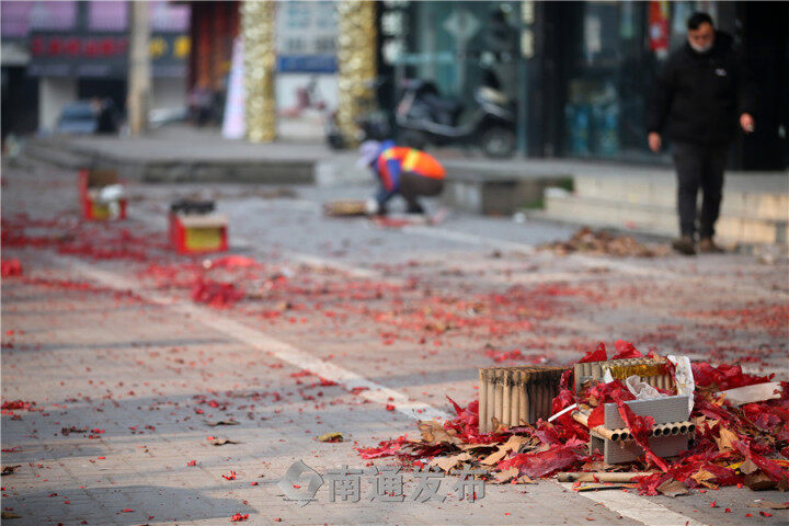 今天一大早,市区人民路一家商铺楼前的空地上,两名环卫工人正在打扫地上的鞭炮碎屑,她们告诉记者,大年初五是一年中最累的一天之一,自觉的人放完会主动清扫,有些人就这么丢在路边。