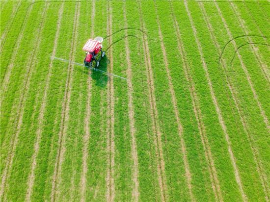该市白蒲镇植保队的植保人员利用大型植保机对小麦进行喷药作业