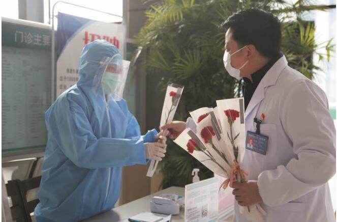 除了给门急诊一线女职工送上鲜花,院领导还给湖北“疫”线的女护士送上节日问候。医院邀请援湖北队员的家属录制了视频,隔空祝福她们女神节快乐。前线队员周晓兰说,这是我过的最有意义的节日。
