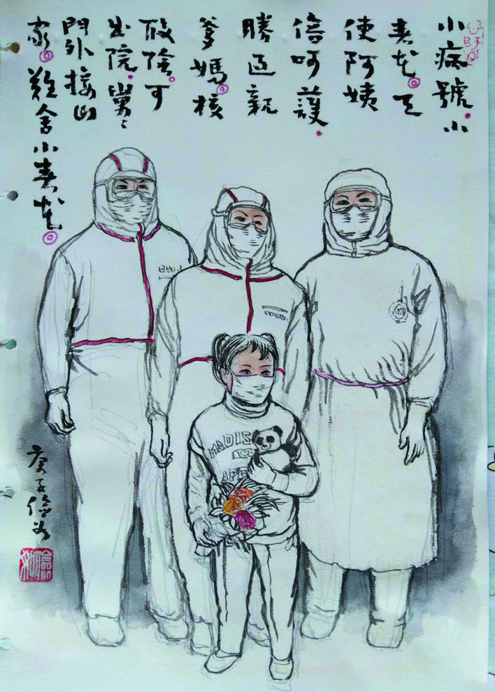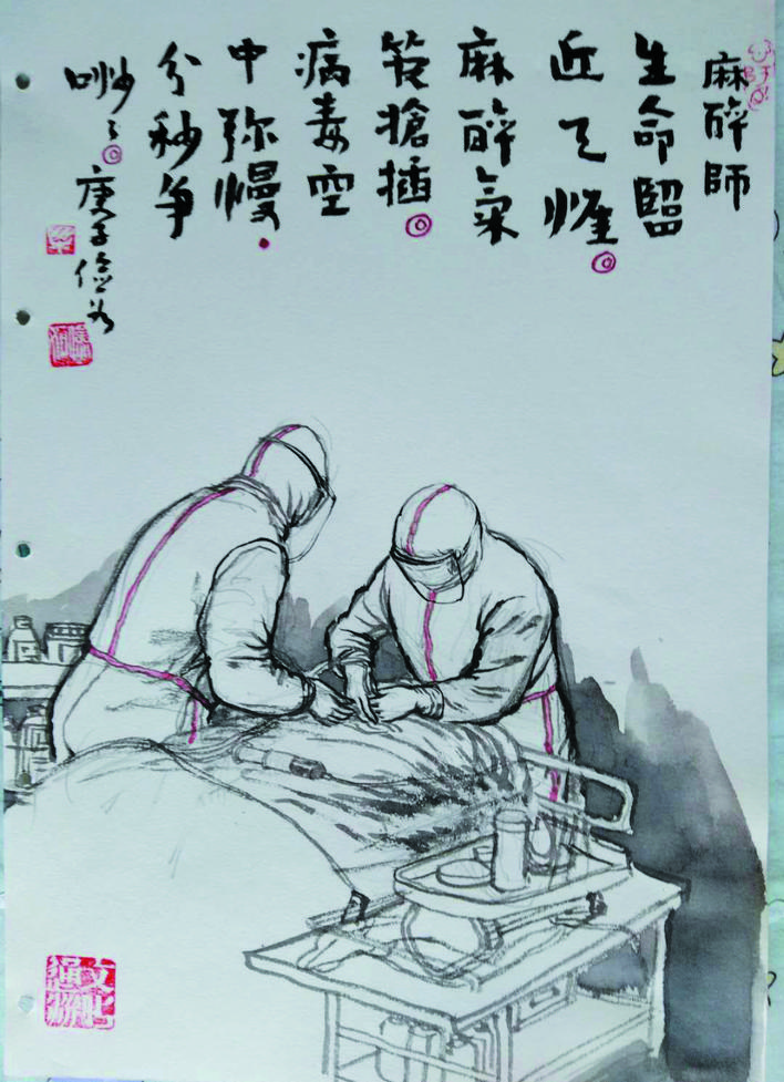疫情发生后,周俭如时刻关注疫情发展,电视、报纸、网络上的一个个感人故事打动了他。为此,周俭如拿起画笔,将脑海中的一幕幕瞬间画了下来。记者了解到,这组作品分别以“隔空送别”“药侠叔”“麻醉师”“最美康复者”“小春花”“后勤组长”为主题,同时,周俭如还为每一张画配了一组诗,观画读诗,令人动容。周俭如表示,这些作品仅仅是全国上下抗击疫情众多感人事迹中的点滴,但正是这些点点滴滴,组成了中国战胜疫情的强大力量。 记者龚丹