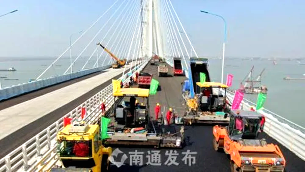 (沪通大桥公路桥面沥青铺设现场)