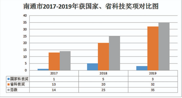 2019年度江苏省科学技术奖刚刚揭晓,我市32个项目榜上有名。而在年初公布的国家科技奖名单中,南通也斩获国家科技进步特等奖1项、二等奖2项,国家和省奖获奖数相比2018年、2017年分别增加10项、21项,在数量上取得历史性突破。