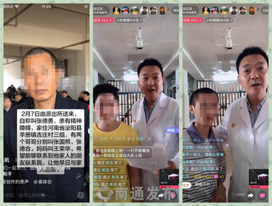3月23日早晨,男子突然说自己叫张德勇,家住河南省泌阳县羊册镇吉庄村三组。获知这一信息后,刘朱建立刻请民政局与当地核实信息,同时拍了一段小视频上传到抖音上,决定发动“粉丝”力量帮助张德勇寻亲。