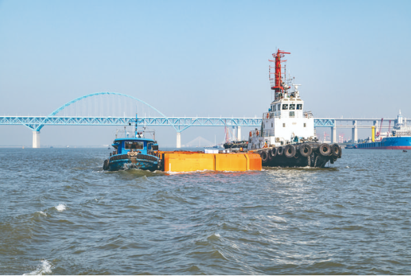 当天首次拖带的是沪通长江大桥26#墩钢制防撞设施首部节段,长35.74米、宽14米、型深3.0米、重92吨(图 通海摄)。它顺天生港专用航道下行,经横港沙临时通道,沿长江主航道上行,顺利到达相应桥墩。目前,沪通长江大桥全线工程建设进入决胜阶段,两地海事部门联合维护桥梁防撞设施运输作业的圆满完成,为保障桥梁施工顺利进行起到重要作用。