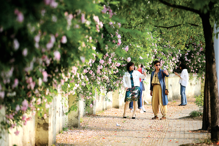 在港闸区通吕运河北岸,探险王国西、江海大道南有条花墙路,4日,走在花墙路上,围墙上的蔷薇花正在盛放。这段“花墙”南北向延伸数百米。许多市民来这边拍照片发到社交网络上与好友分享。 记者徐培钦 |