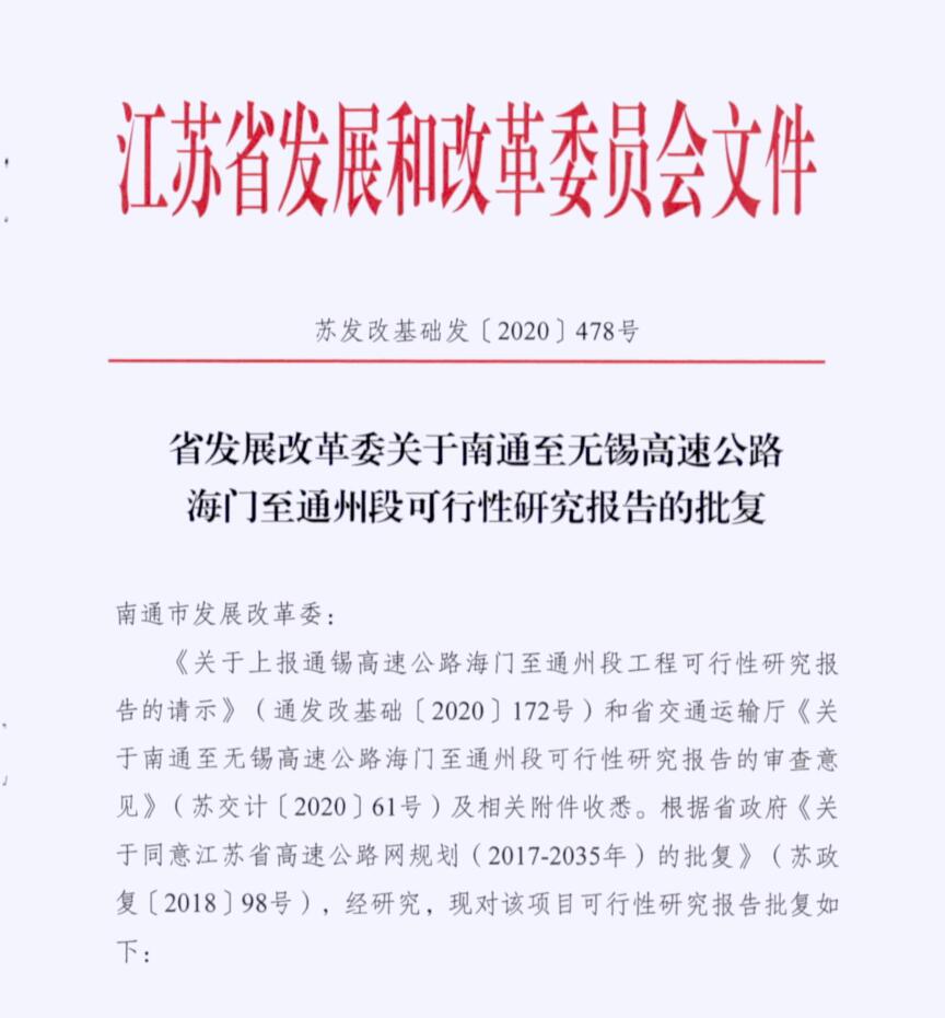 为落实长三角区域一体化发展战略,完善区域高速公路网络,构建南通市高速公路外环,优化过江交通需求分配,2020年5月19日,江苏省发展改革委正式批复了锡通高速公路海门至通州段(南通绕城高速)工程可行性研究报告,同意建设南通至无锡高速公路海门至通州段。
