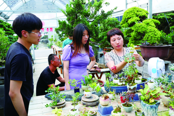 “中国小微盆景基地”近日落户如皋,该基地是国内首家集小微盆景创作、生产、销售、培训于一体的专业化、市场化小微盆景集聚区。同时,中国小微盆景网上线,为农户和消费者提供一站式综合性购销平台。图为13日,如皋花木大世界(国际园艺城)内形态各异的小微盆景吸引了年轻人的目光。 记者 许丛军摄 |