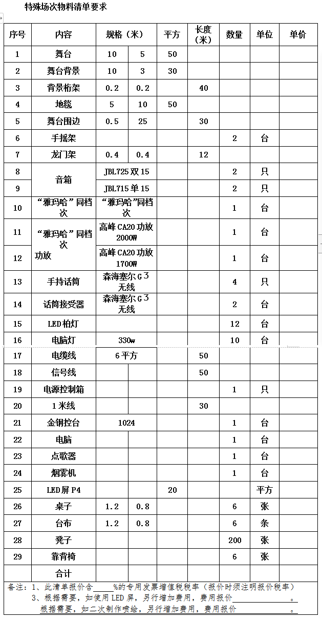 四、采购项目的预算:≤24万元(超过此预算投标,作无效响应处理。含不少于3%专用增值税发票。若新冠肺炎疫情期间,国家调低专用增值税发票税率,则按报价裸价加调低的专用增值税发票税率合计金额进行结算。原则上总额正负不得超过10%,受新冠疫情不确定因数影响,本活动项目若超过或减少场次及内容,均按实际发生场次和成交清单单价结算。