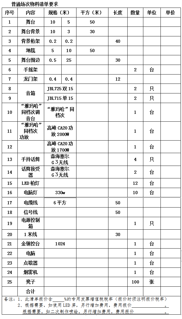 全年活动总场次约30场次,实行费用包干核算。其中,包一:普通场次(以上活动演艺阵容内容要求+普通场次物料清单要求)预计占2/3, 普通场次≤6000元/场次;包二:特殊场次(以上演艺阵容内容要求+特殊场次物料清单要求)预计占1/3,特殊场次≤9000元/场次。