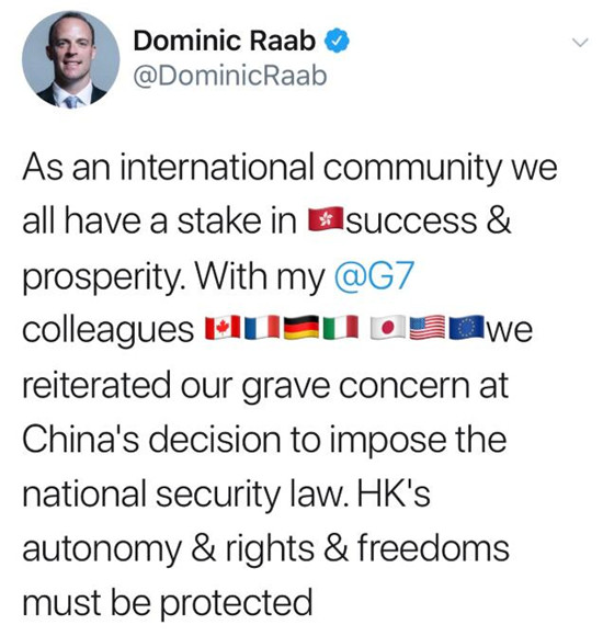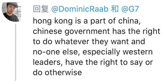 △英国外长多米尼克·拉布在社交媒体上发布有关G7声明的推文,港独分子蜂拥点赞 ,不过,一位英国穆斯林网友评论说:“香港是中国的一部分,中国政府有权以任何方式处理内政,其他国家,特别是西方国家领导人无权对此说三道四。”