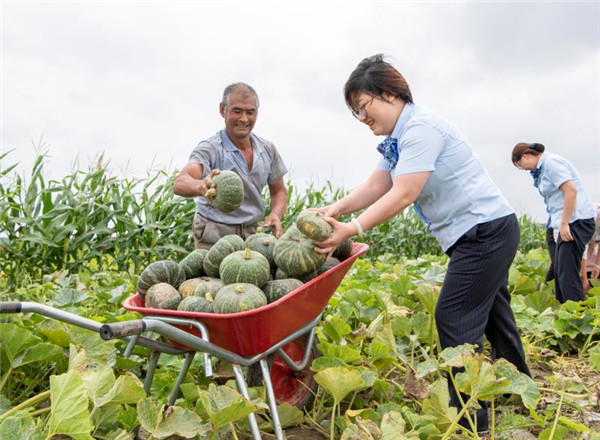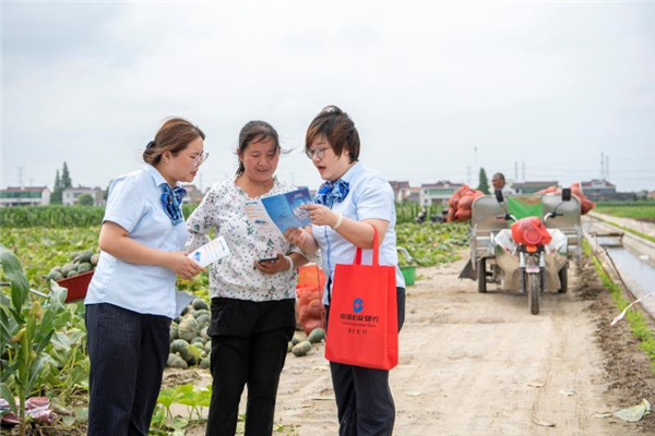 中国建设银行海安支行发挥自身优势助力脱贫攻坚,金智惠民进乡村,打通乡村振兴“最后一公里”。2020年6月21日,该行营业部张富清金融服务队队员来到海安农场天鹅村,帮助村民在下雨之前抓紧采收南瓜,向农户了解农业生产情况和金融服务需求,宣讲农户关心的金融知识和产品,村民连声夸奖:建行服务实打实!参加活动的青年员工陆群感叹:田间劳作确实辛苦,助农服务让自己深受教育。通讯员 徐劲柏