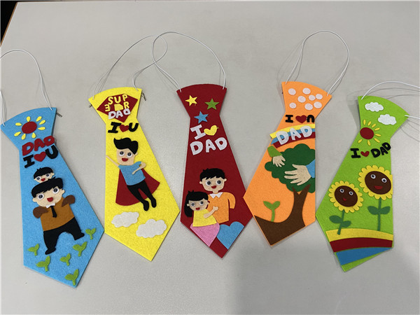 制作完成后,孩子们亲手为爸爸带上了自己制作的领带,并送上手写的祝福贺卡,字里行间满是对爸爸的爱意和祝福。带上领带的爸爸们难掩欣慰之情,纷纷表达自己的喜悦与兴奋,凸显“潮”流形象。孩子们用双手定制了属于自己和父亲们的“独家记忆”。
