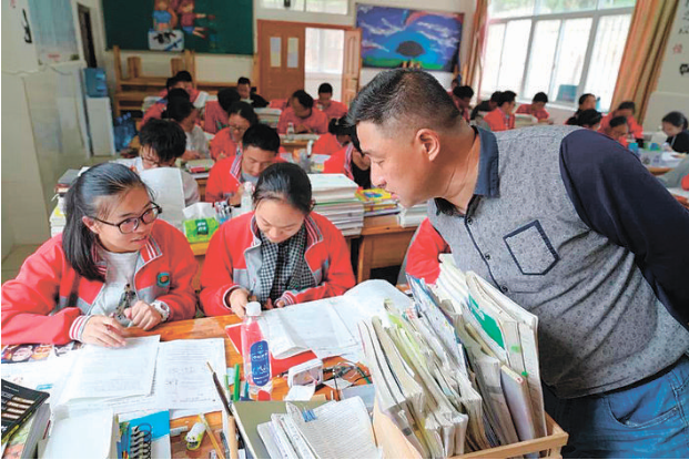 参与宁蒗第九轮支教的海安一班班主任李忠东老师,在检查学生的学习情况。