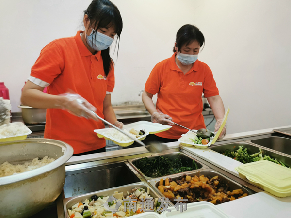 老人口中的“外卖”,实为其子女通过居家养老送餐热线电话下单预约的订餐服务,而餐食正是出自位于工农南路185号南通阳光老年公寓的中央厨房配餐间。送餐员朱俊慧说,她们一般上午10点50分出餐,确保11点左右送达老人家中,送餐半径基本为老年公寓周边的“十分钟生活圈”,因为这样才能够确保老人取到时菜还是热乎的。“我们每天的送餐过程严格按照标准化操作,抵达老人家楼下须先在‘南通居家养老APP’页面点击‘签到’键,带好一次性手套,上楼将餐食放在门口约定的临时放置点。”