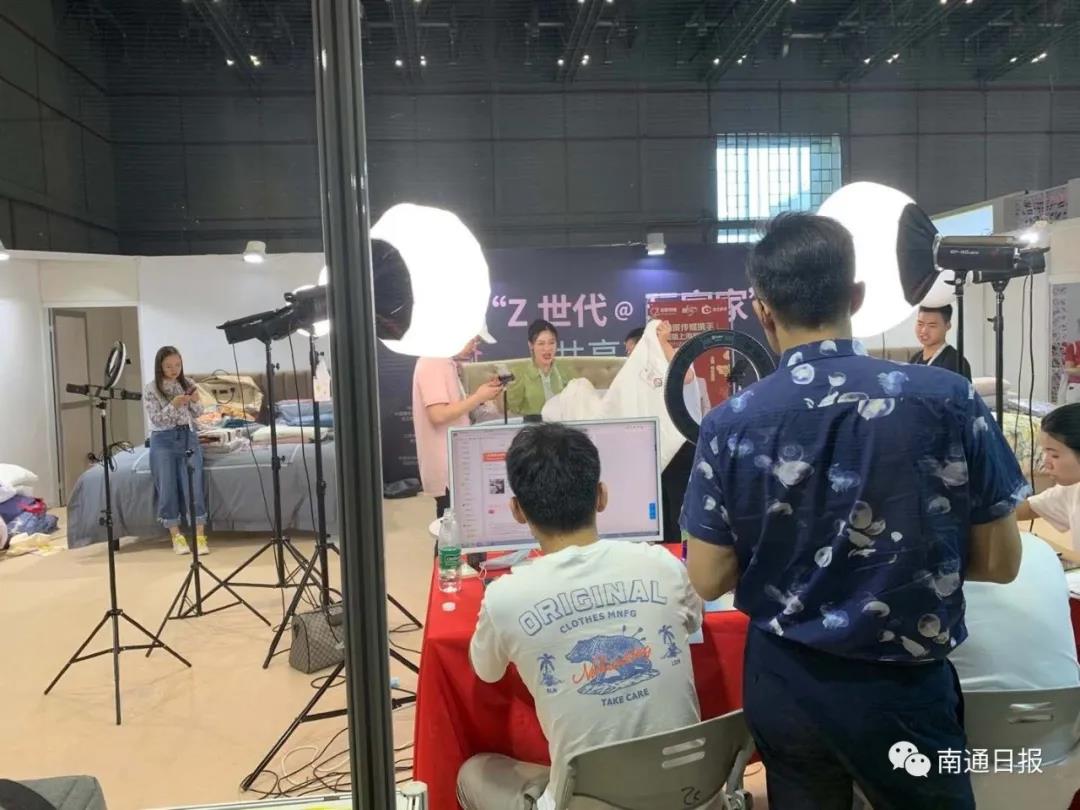 “九号链接,200条,3、2、1……没了,再加200条!”在家博会的“Z世代@玩家家”共享直播区,“吆喝”声此起彼伏。一众“大牛”“网红”在此集聚,面对打光灯和手机,为身后的家纺产品带货。
