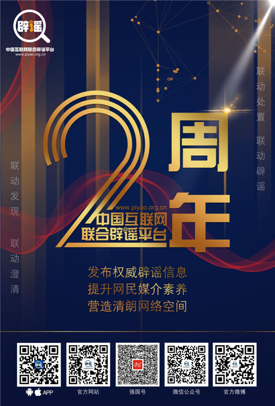 目前,中国互联网联合辟谣平台已拥有网站、客户端、强国号、微博帐号、微信公众号、抖音号、新华号、头条号、百家号以及辟谣小程序等多个端口,全方位提供辟谣信息服务。指尖触及的地方,就是我们的阵地;网络延伸的空间,就有我们的身影。迷惑的,质疑的,求证的,请一键@中国互联网联合辟谣平台,真相就在这里!