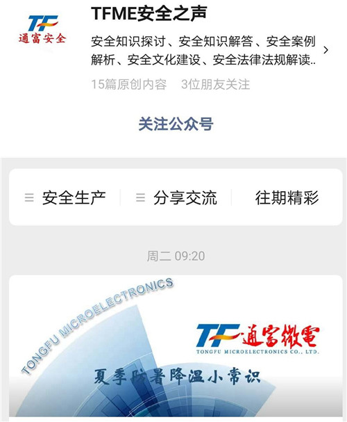 打开通富微电“TFME安全之声”微信公众号,安全规章、安全问题、安全活动、事故案例解析、安全教育PPT、安全教育视频等各个版块一目了然,安全信息定期发布。“值得一提的是,公众号内还设置了‘倾听你的声音’,在工作和生活中有任何针对安全部门的意见和建议,都可以在这个版块留言,为做好全厂安全工作建言献策。我们有不少好的建议,就来自员工及其家属。”通富微电党委副书记石锋说,企业还将安全生产纳入“三会一课”、工会和团委活动,作好全员安全生产教育。