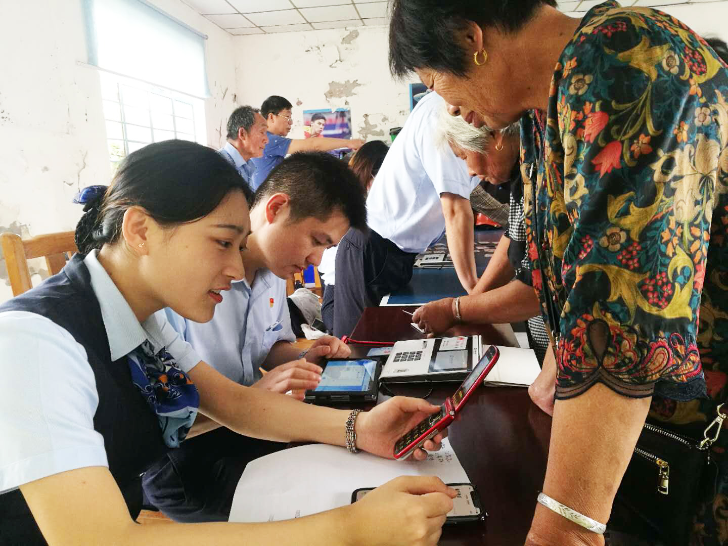 建行海安支行以9个党支部为“红色网格”,主动对接各乡镇,以开展党建共建结对为契机,深入各乡村开展社保卡激活。各党支部组成“张富清金融服务队”,主动放弃周末休息时间,利用“龙易行”等便携设备,在各村党群服务中心为村民开设绿色金融服务渠道,激活社保卡,保障农保正常代发。