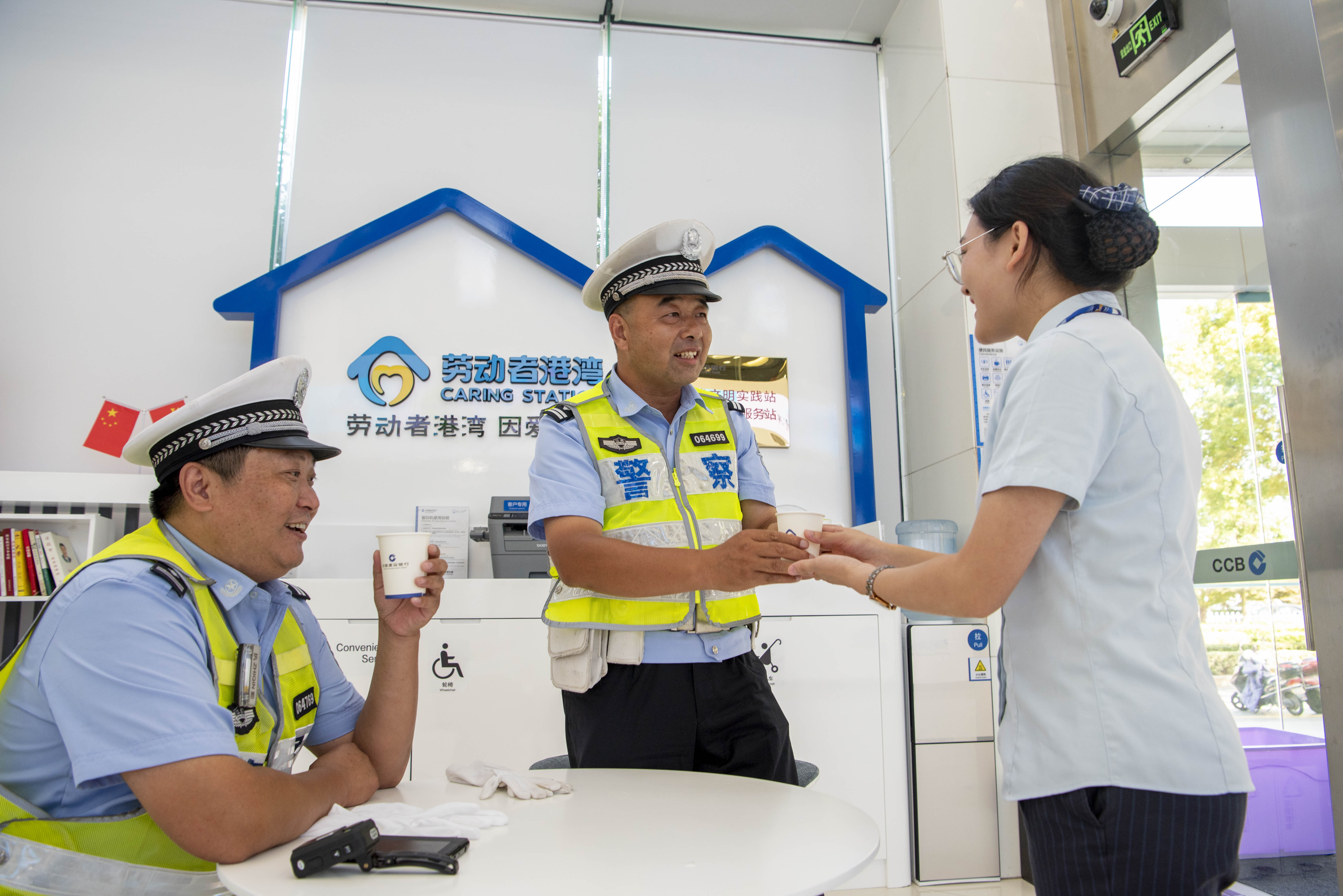 建行海安支行营业部员工为交警送上茶水。