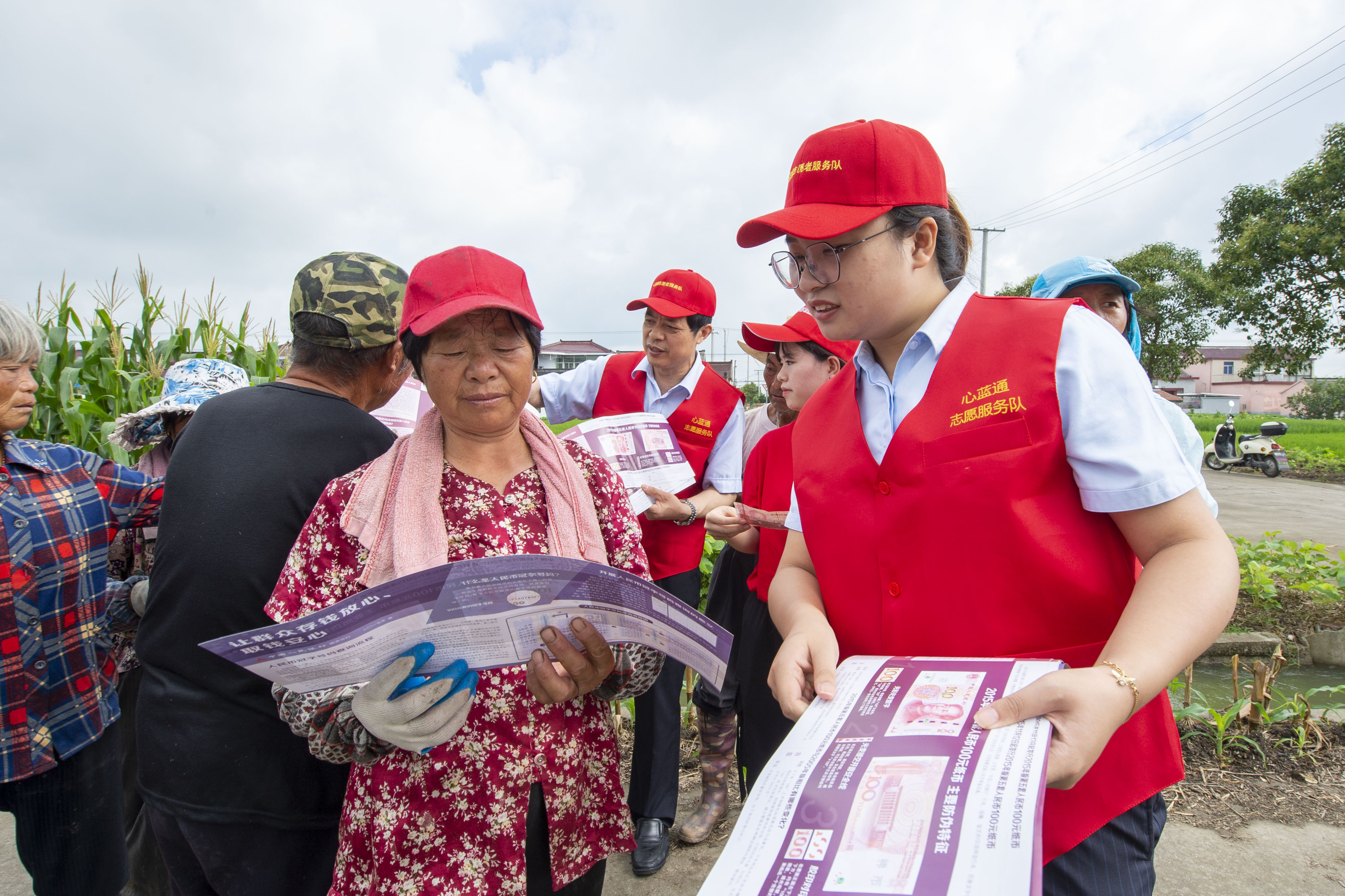 建行海安支行心蓝通志愿服务队队员在海安市白甸镇官垛村向村为宣讲金融知识。